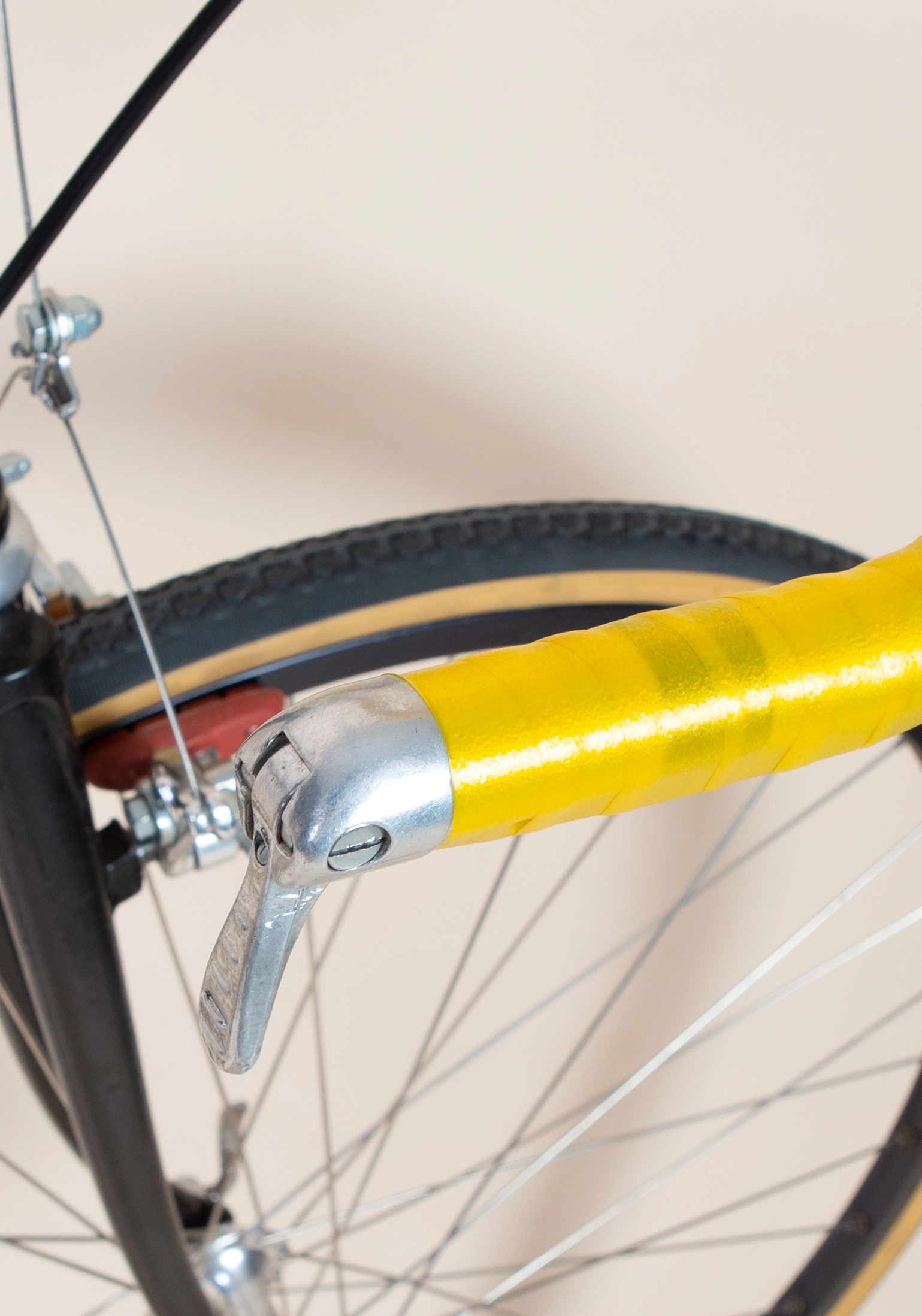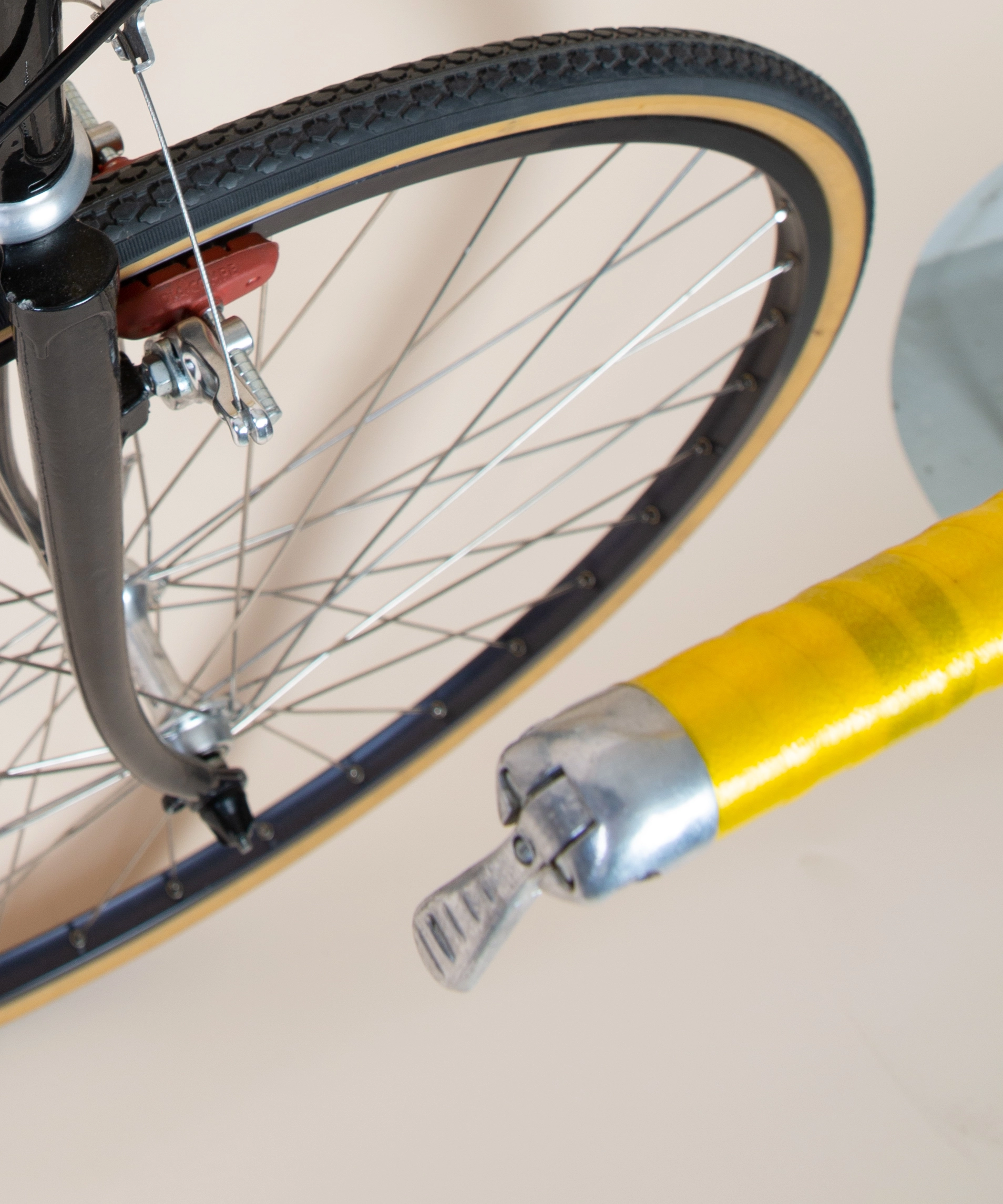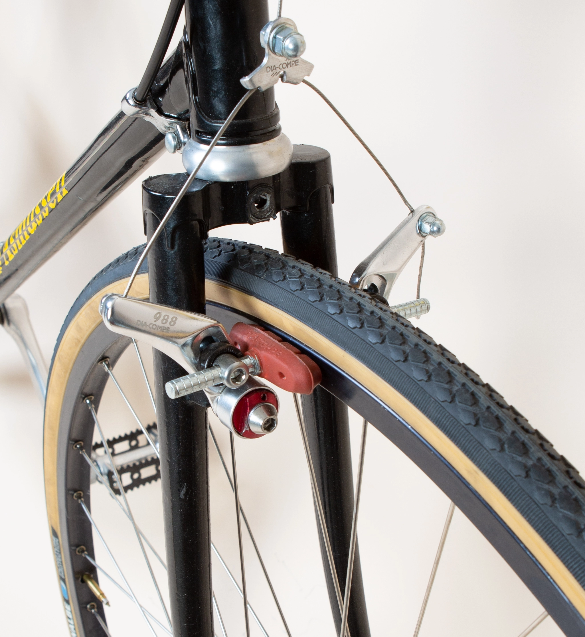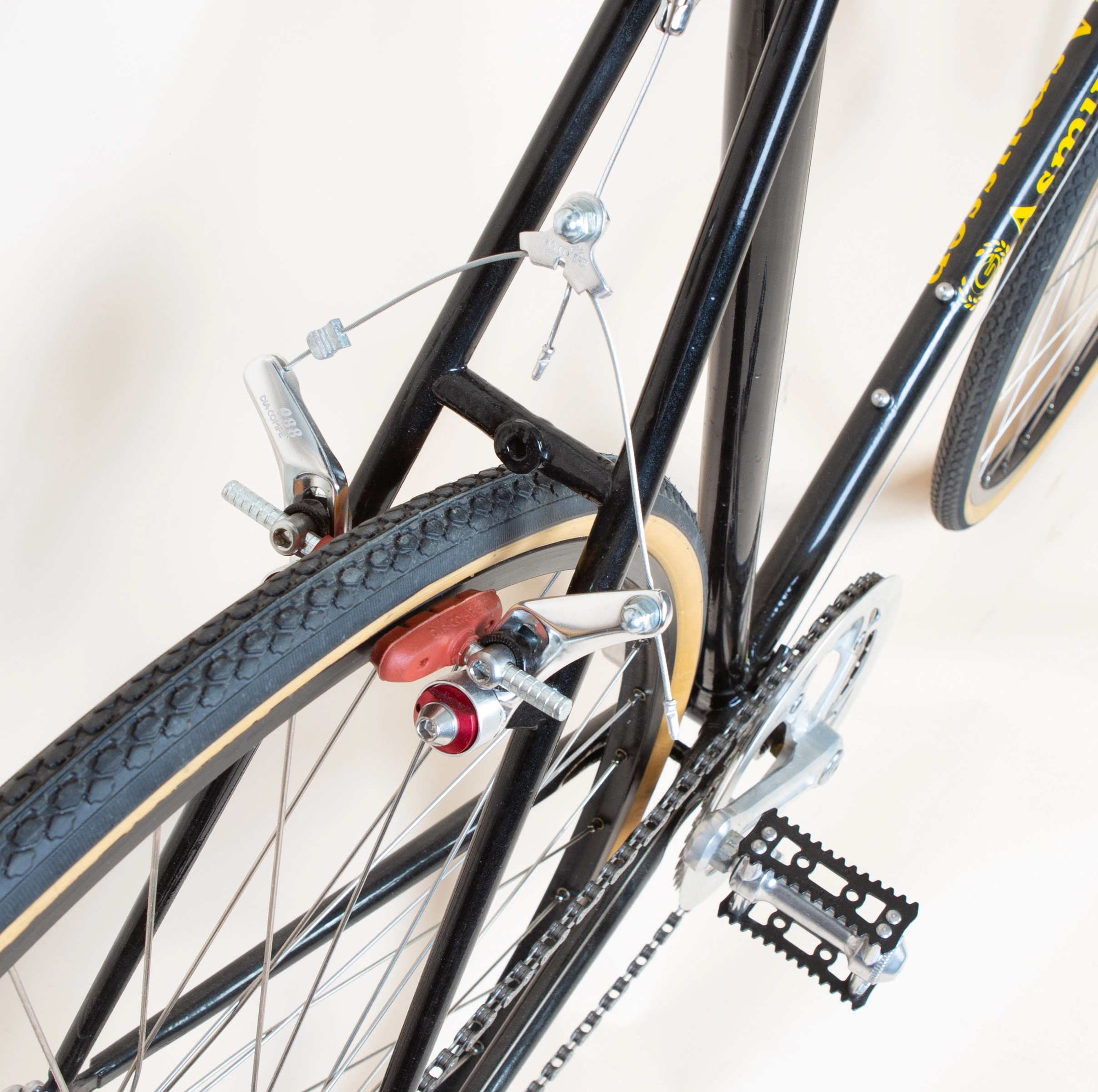 Dia Compe cantilever bremser, Shimano 600 bremsegreb. Dura ace krank arme, SR Sakae sadelpind og frempind. Nitto Randonneur styr. Suntour cyclone gear, bar end skifter.