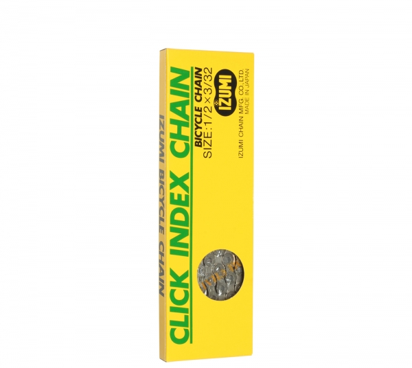 Kvalitets kæde fra japanske Izumi. Cr-Mo stål Sølv plated. Specielt udviklet til indekseret gear . (Gear med 6 eller 7 klik i gearvælger) passer bedst med 6 eller 7 speed skruekrans eller kassette.