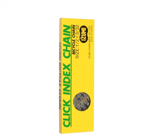 Kvalitets kæde fra japanske Izumi. Cr-Mo stål Sølv plated. Specielt udviklet til indekseret gear . (Gear med 6 eller 7 klik i gearvælger) passer bedst med 6 eller 7 speed skruekrans eller kassette.