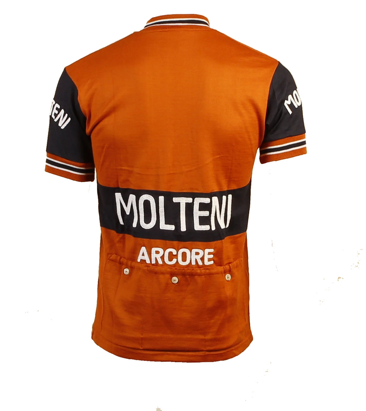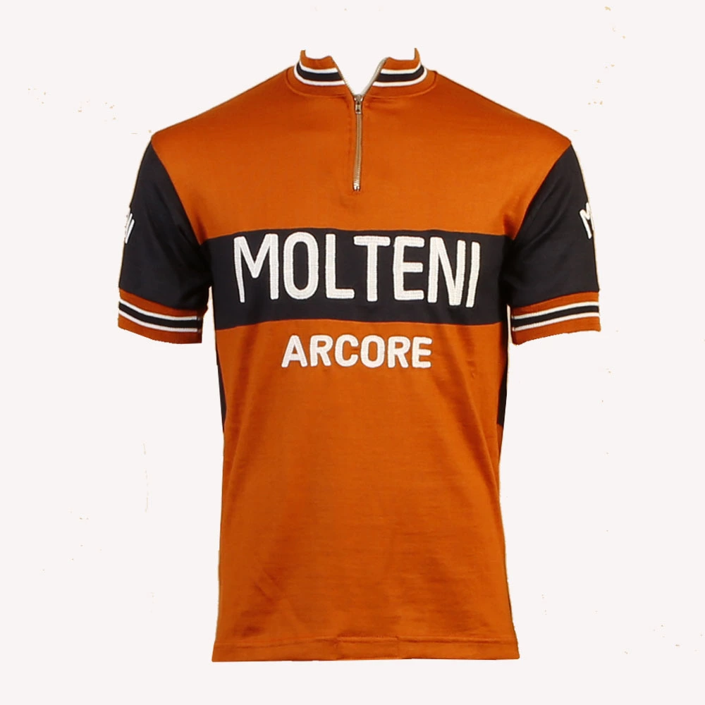 Special-designet Molteni trøje: Det danske retro-cykelhold Squadra Molteni’s signaturtrøje Behagelig og holdbar 50% uld, 50% akryl blanding Broderet bogstaver Traditionel kort lynlås 3 baglommer med knaplukning Produceret af italienske Tre Emme Squadra Molteni: www.squadramolteni.dk/