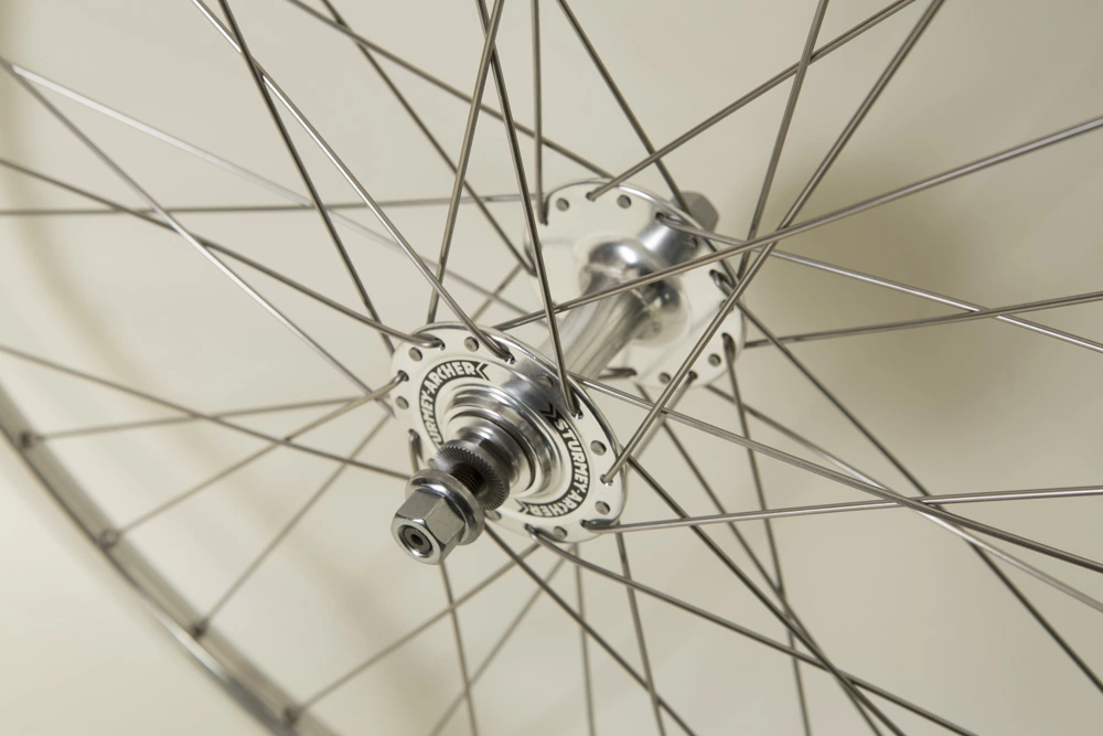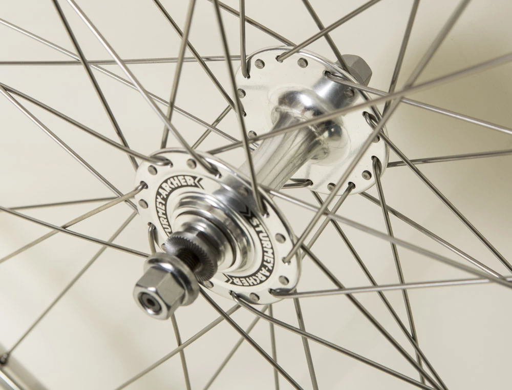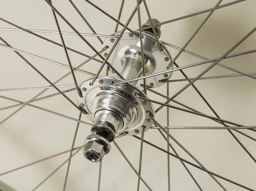 Hjulset Sturmey Archer. Bane / single speed hjul. sølvpolerede. Fælg: 700 C. Fælg ind. mål: 13 mm, udv. mål: 19 mm.